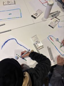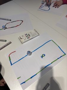 Der Ozobot folgt einer schwarzen Linie und erkennt Farbcodes, die in die Strecke integriert werden. Nachdem die Grundlagen der Programmierung bekannt waren, konnten die Kinder der Klasse jeweils zu zweit an verschiedenen Strecken-Herausforderungen arbeiten und auch eigene Ideen für eine Strecke umsetzen. Zum Abschluss haben sie in Gruppen eine kleine Geschichte mithilfe der Ozobots erzählt.